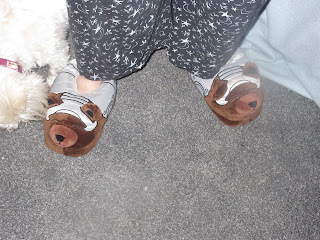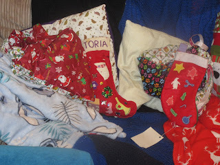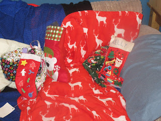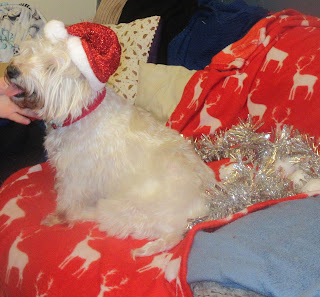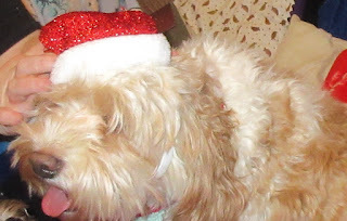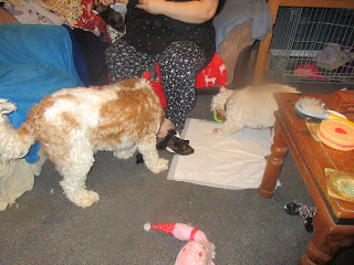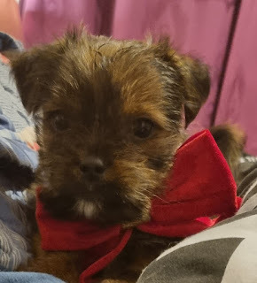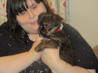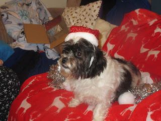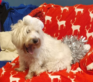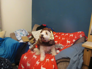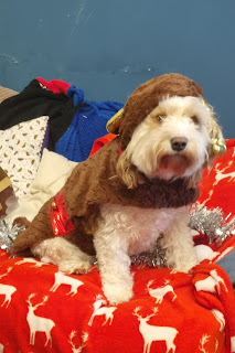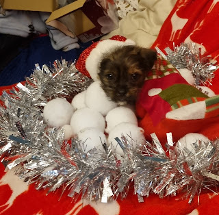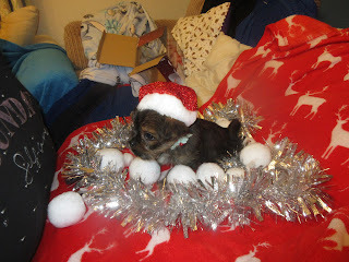We didn't have a doggy outfit small enough to fit Cai, so instead we turned him in to the early Christmas gift he is for my Mam, and put him in a stocking. So, here he is: