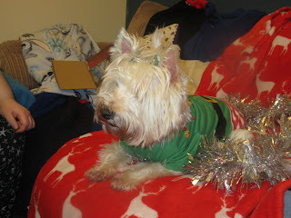 Lilie had an elf outfit. She wore this one last year too, but this year she’s wearing the festive collar I made her with it instead of one of her holiday bandanas, has little clips with tiny Christmas trees on them in her fur near her ears, and isn’t wearing the snowflake doggy legwarmers she wore with it last year. Anyway, here’s our little Westie elf: