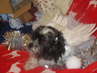 Izi had an angel outfit. It has a little tutu, a pair of angel wings, and a little halo that rests on top of her head. She’s also wearing her festive collar. Anyway, here’s Isabel the angel: