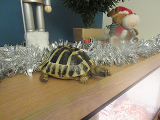 Artemis had dug in for a nap by the time we were done with the dogs' photos, so the tortoise's holiday photo had to wait. Kelly and I ended up taking it the following day. So, here's Artemis' holiday photo, which shows the tortoise among some tinsel (you may be able to see bits and pieces of some other holiday decorations in the shot, but it's mostly just the tortoise and the tinsel).