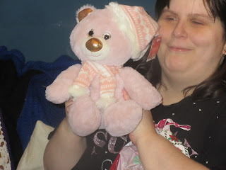 As for me… I got more of my favourite kind of vegan chocolate, some mini candy canes, a pink bear wearing a red scarf and Santa hat, which I’m holding up in this next photo: