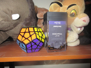 I also got a new kind of puzzle toy that’s like a rubix cube with extra sides, and a set of large purple dice from my Dad, the latter of which I can kind of feel the numbers on…