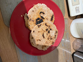 I've been wanting to try and make flatbread for a while - had the recipe for who knows how long, and just never tried it - so was glad when it was suggested as a potential thing to make on one of the cooking calls, giving me an excellent excuse to give it a try. We made it this past Tuesday, and I think it turned out well. I took a photo of some of mine before I ate it all, so here's the photo:
