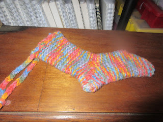 One was this little multi-coloured loom knitted stocking, which I made when I was learning to do a heel for socks. I was going to make a pair of socks, but I just grabbed a small loom, and I had the wrong one, so it’s too small to be a sock. I figured it would make a cute holiday decoration though, so added a loop to it with an icord so it could be hung up. Anyway, here’s a photo: