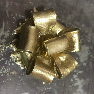 Next, I made the Christmas bow. I cut 11 pieces of white fondant 2 cm wide and 7 cm long. I folded these over loosely and gathered the edges to make the loops. I cut out a small circle of white fondant and attached five of the loops to the circle in a circular shape. I left this to set of 30 minutes. I then attached the next 5 loops, ensuring that each new loop was over the gap between the two loops underneath. Lastly, I attached the final loop to the middle of the Christmas bow. I left the bow overnight to dry thoroughly and then I painted it with edible gold food colouring.