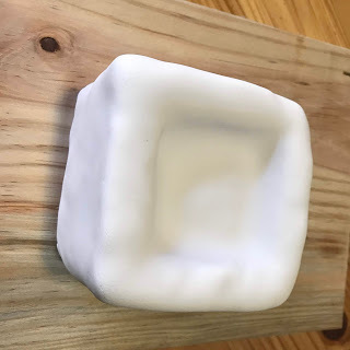 The box lid was easy to make. I rolled out white fondant to a thickness of 5mm. I then cut out a square slightly larger than the tin I used to bake the top cake. I cut four sides out of the white fondant. Two were the same length and approximately 1/5 of the depth of the top square cake. The other two pieces were 10 mm shorter. The shorter pieces fit inside the longer pieces when forming the sides of the lid.