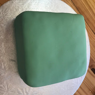 The next weekend I iced the cakes. I cut a square hole into the top of the smaller square cake and then covered the entire cake with a thin layer of royal icing. I rolled out a large piece of white fondant and gently placed it over the entire cake, smoothing it downwards with my hands.