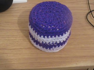 We were making toilet roll covers in one of the recent ACB Crafters crochet classes. Well, we were meant to be making pumpkin ones, but since the only orange wool I have is what I don’t want to be touching until I’ve made the tea cosy for my witchy tea pot, I just grabbed a random ball, which turned out to be purple. Then I decided to make it two different colours so grabbed another random ball, which turned out to be a different shade of purple. Then I just didn’t add the extra bits that would make it look like a pumpkin (the stem and leaves). The end result was this two tone purple toilet roll cover: