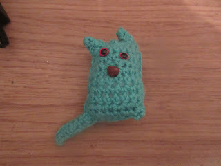 I know it's the wrong colour, but never mind. I got bored of playing, "What colour is this?" so just went with the last ball I'd asked about when I got fed up of asking. Anyway, it looks more like a turquoise pikachu (one of the Pokemon) than a cat, so I'm going to have to make a yellow one with a slightly zig-zag-shaped tail so I can actually accurately call it a crochet pikachu. LOL!