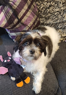 So, in the below photos, Lilie, Logan, and Izabel (Izabel is Mam's dog, for anyone who doesn't know) have a little purple charm on their collars that’s a bat on a bow, and a dog toy that’s a black and pink bat with orange feet in the shot with them. The bat toy is one of a pair of them I brought for the dogs recently. Lilie had already removed the squeaker from hers before we thought to use them as props for the photos, but Logan’s was still in good enough shape to use. Anyway, here are the photos: