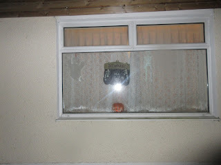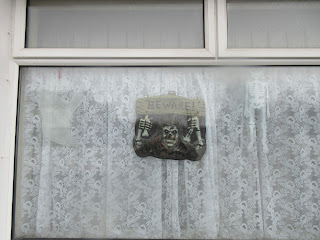 And some of my hanging decorations (a ghost, a skeleton, and a “BEWARE” sign) which are pictured here first during the daytime and then during the evening when it was getting dark: