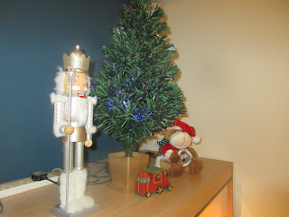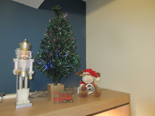 I set up my little fibre optic tree, and put my large wooden nutcracker and my reindeer teddy that plays “Grandma Got Run Over By A Reindeer” on either side of the tree, plus set a little wooden train in front of it. Here are a couple of photos of the setup, taken from different angles: