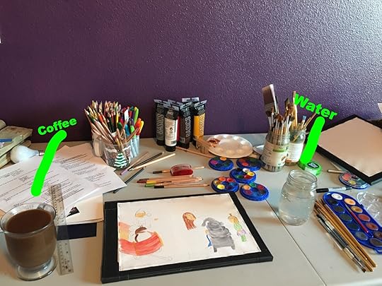 Illustrated advice for the right handed watercolor enthusiastI love to paint with watercolors.I am right handed.I love coffee.Here's a picture of my messy work station. Please note the location of fluid contents. For left handed watercolor enthusiasts, I recommend reversal.