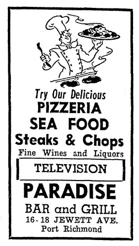 As I searched for the history of apizza in Connecticut, I happened upon another name for pizza, one that really surprised me because its meaning has shifted: pizzeria. Now a common name for a pizza parlor, at one time it was a word for pizza itself, as is evident in the advertisement for “delicious pizzeria, 25¢” at Frieda’s in Asbury Park NJ in 1936, shown above, or at the Paradise Bar and Grill on Staten Island in 1947 below.