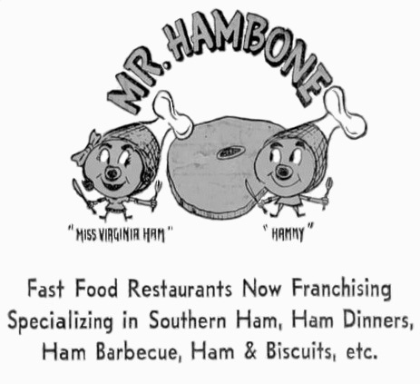 I especially like the logos that attempt to humanize food, particularly unlikely items such as hambones. Sadly for him and his girlfriend, Mister Hambone International – aka Hammy — really didn’t catch on. Starting out in Virginia in 1969, he opened at least one place in North Carolina, but nothing, I think, internationally.