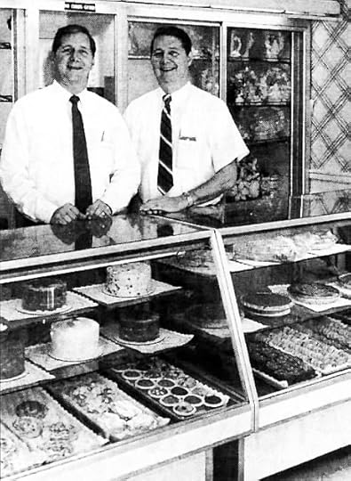 The Salad Bowl’s founders were Elmer and Anna Sewing, whose three sons would one day take over the cafeteria, having gained plenty of hands-on experience working there in their younger years. At its final location at 3949 Lindell Blvd. the sons, David and his twin brothers Norman and Norbert, took full charge after their father’s death in 1976. Knowing they had to expand the business, they encouraged greater use of the banquet rooms. To draw customers during the day the sons made the rooms available for free to clubs and organizations for meetings and talks if their members and attendees went through the cafeteria line. [Norbert and Norman Sewing at the bakery counter, 1989]