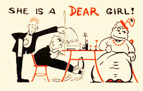 Gold diggers also appeared in cartoons and on postcards, usually shown in a restaurant, eating and drinking freely and running up the check. So they not only took advantage of men, but their other sin included eating too much, in violation of the idea that true ladies had naturally small appetites. The examples below are presented in approximate chronological order.