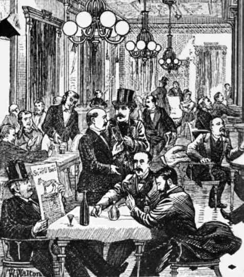 In the 19th century and well into the 20th there was absolutely no doubt that Delmonico’s was the nation’s finest restaurant, for decades the only one with a worldwide reputation. It was one of the few places in this country that European visitors compared favorably with the glittering restaurants of Paris’s “super mall” of the 19th century, the Palais Royal. [above: cafe section of Fifth Avenue and 26th Street Delmonico’s]