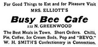 The Busy Bee Café was run by Texas-born Savannah Elliott, also known as ‘Mother Elliott” despite only being in her 30s. In 1918 the newspaper mentioned that she entertained groups, such as teachers, and birthday dinners with as many as 17 guests. She sold the 112 N. Greenwood location at the end of that year, and moved to a new place that she operated briefly before again moving to Kansas City MO. In KC she and her husband ran a café called the Blue Goose. [1917 advertisement]