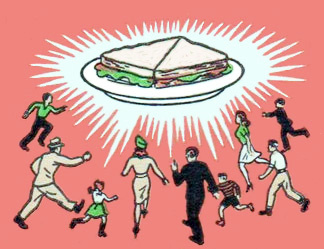 While some eating places stuck with hot meals at noon in the early 20th century, others were quick to embrace sandwiches, particularly lunch rooms, tea rooms, drug stores, and delis. The sandwich shop was declared the winner among fast food restaurants. To critics the proliferation of this slapped-together fare was a sign of cultural decline. “The postwar decade might be known as the era of the sandwich,” declared cultural observer Eunice Fuller Barnard in a New York Times article of 1929 with the mournful headline, “We Eat Still, But No Longer Do We Dine.”