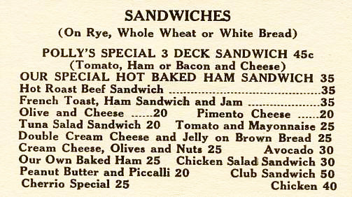 Among the other interesting sandwich combinations I’ve found are Cucumber & Radish (25c at The Cortile in NYC in 1928); Egg and Green Pepper with Mayonnaise on Whole Wheat Gluten Bread (25c at Schrafft’s in 1929); “Chef’s Pride,” Smoked Tongue, Sliced Chicken, and Deviled Eggs double decker (50c at Townsends, San Francisco in1933); Peanut Salad (10c at The Candy Box in Winona MN in 1935); Peanut Butter, Sliced Tomato, Bacon, and Lettuce triple decker on toast (25c at The Little White House in NYC in 1936); and Marshmallow and Peanut Butter (15c at The Bookshop Tearoom in Springfield MA in 1946).