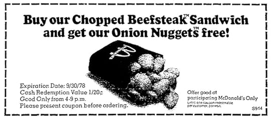 In 1978 McDonald’s began test-marketing their own version of deep fried onions, using chunks instead of rings and calling their “french fried chopped onion product” Onion Nuggets. But the nuggets didn’t make it past the test stage, reputedly because they got cold too quickly. Restaurant onion rings, in general, were often criticized for being served cold – as well as for being limp and greasy.