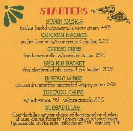 If grazing was a form of “light eating,” that could not be said of the appetizers introduced in the 1970s and 1980s by casual dinner house chains such as TGI Friday, Chili’s [1987 menu above], and Bennigan’s. Now the idea of an appetizer was completely turned on its head. Far from a light morsel that would induce appetite in someone with digestive issues, it became a digestive issue in its own right — deep fried and loaded with fat. The menus of leading casual dinner chains overflowed with “Starters” such as deep-fried breaded cheese, “loaded” potato skins, cheese fries [pictured at top of post], and heaping piles of nachos laced with pico de gallo and cheese. Diners might need a 19th-century digestive tonic after dinner.
