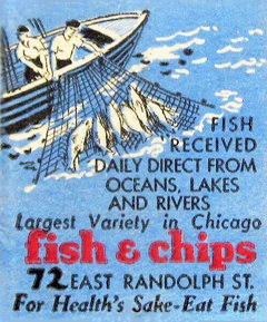 Fish & chips, inc. was conveniently located in the Loop, across the street from the central Chicago library, now the Chicago Cultural Center. It was a handy location for a 1943 dinner of the literary members of the Boswell club, admirers of Doctor Samuel Johnson. In their honor the restaurant posted one of Johnson’s quotations over their table in which he criticized French menus, requesting “thy knaves to bring me a dish of hog’s pudding, a slice or two from the upper cut of a well roasted sirloin, and two apple dumplings.”