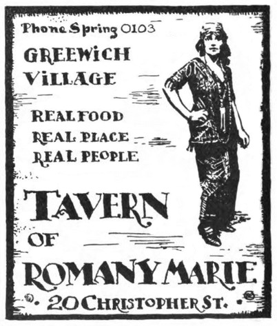 A bohemian version of a Romanian Restaurant was operated by Romany Marie in Greenwich Village. Sculptor Isamu Noguchi characterized it as “a sort of a transfer of the Paris café life to New York.” It’s likely this was true to some degree of many Romanian eating places which tended to exude a sense of good cheer and camaraderie all their own. [above: 1924 advertisement]