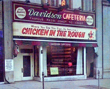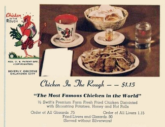 And, yes, that is also true of Chicken in the Rough, a franchised process for preparing fried chicken. As recently as now, Palms Krystal Bar & Restaurant in Port Huron MI offers “The World’s Most Famous Chicken Dish,” as it has for decades. In 2000 a Palms order consisted of an unjointed half fried chicken, with shoestring potatoes, hot bun, and jug of honey. Two orders cost $9.99 and they even threw in free coleslaw. In the 1930s an order usually was priced at 50 cents. [above, 1940s menu from an Arkansas restaurant]