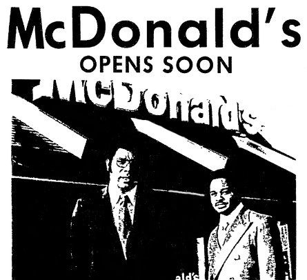 Big Mike’s owner Mike Watley, a social activist and close associate of comedian Dick Gregory, explained that he could not compete with a national corporation. With lower sales volume, he paid higher prices for food, a situation intensified by being given less financial support. His meat supplier, he said, capped his credit at $100, while white customers could run up their bill to three or four thousand. Although Watley blamed his failure on competition from a “white-owned corporation,” the nearby McDonald’s franchise was owned by two Black men, one of them Wayne Embry, a former player with the Milwaukee Bucks. Their McDonald’s venture was quite successful. [Above: Big Mike’s, Milwaukee, 1969; Below: Wayne Embry, left, and his partner, 1971]