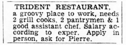 The Trident’s early menus were filled with cosmic advice in tiny type, dispensing such pseudo wisdom as “One must rise by that which one falls,” and “You can’t know what is in if you’re never off.” However, the messages at the menu’s bottom brought the patron back to earth with a thud, advising, “Sorry we do not accept checks,” and “When necessary, table service minimum of $3 per person.” [Click to see later Trident menus]