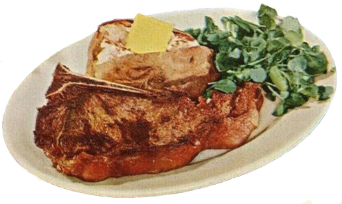 Meat and potatoes – The popularity of restaurant meals containing both components was intense in the 19th and 20th centuries. The mutton of the 19th century vanished but the love of beef seemed eternal. This was the bedrock American diet, especially popular with men who patronized steak houses. It was not challenged until the 1970s, mostly for health reasons, and yet did not disappear.