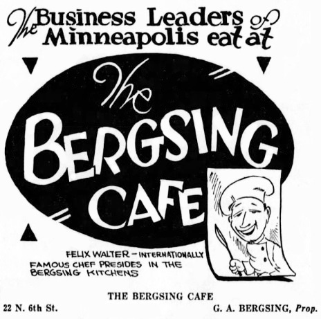 Another example of a respectable offender was the Bergsing Café in Minneapolis, described by the authors of Minnesota Eats as a “gentle speakeasy.” Patrons could be sure their reputations would not suffer if they ate there. As the 1929 advertisement shown above proclaims, it was popular with business leaders who evidently were not bothered by the practice of serving drinks to certain customers.