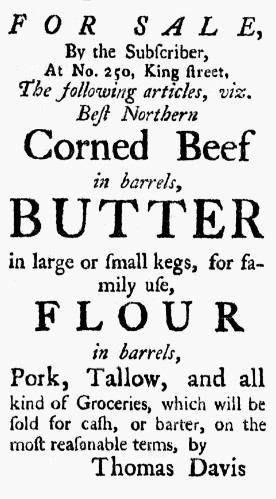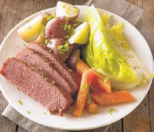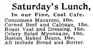 Corned beef and cabbage? That was a dish that appeared on a variety of 19th-century menus before it was widely defined as Irish. For one thing, corned beef, or any meat that was preserved in barrels with salt, had been available throughout the 19th century (and earlier), and was not identified with any particular nationality. [above advertisement from 1788] And in 1850 McKenzie’s Exchange in New Orleans offered corned beef and cabbage, right along with curried frog and barbecued gopher. Hudson’s department store in Detroit put corned beef and cabbage on an 1896 summer menu. [see below]