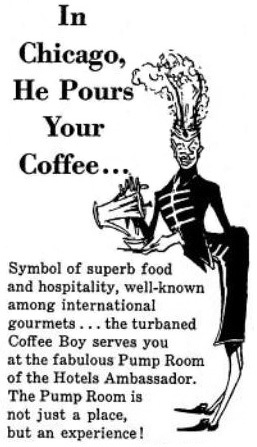In addition to being swanky — with dark blue walls, white leather upholstery and crystal chandeliers — and well connected to the gossip pipeline, the Pump Room drew attention for its culinary burlesque shows featuring costumed staff, flames, and choreography. Waiters – all white men – wore scarlet jackets and black satin knee pants, while the “coffee boys” – all young black men – wore emerald green or white uniforms with giant ostrich plumes seeming to spring from their foreheads. [see grotesque caricature shown below, 1957] There were also “curry boys” dressed in gold. Food was served from wagons except for that skewered on flaming swords.