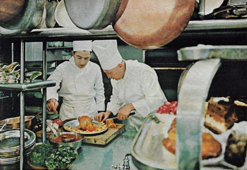Two free drinks became an attraction offered by a number of airlines as they ramped up their meals. Competition in cuisine became intense among the major carriers in the 1960s, in some cases involving the participation of fine, or at least famous, restaurants. This was perhaps inspired by Pan Am who recruited Maxim’s to supply meals for flights departing from Paris. Soon airlines in the U.S. began to conjure intriguing flight names such as Famous Restaurant Flights, Captain’s Table, and Royal Dining Service. American Airlines enlisted “21″ to supply flights leaving NYC, while Eastern – once catered by the Y.M.C.A. – signed up the elite Voisin for first-class flights from New York and the Pump Room for those from Chicago. Eastern discarded its humdrum serving pieces [at top of page] of old for Rosenthal china and stylish silverware [shown below]. As a commentator said in 1967, “ Practically every airline worthy of the name also calls itself a flying five-star restaurant.” [above, Voisin chefs preparing food for Eastern Airlines, 1965]