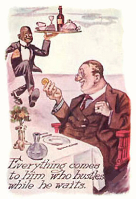 Some patrons preferred Black servers to white ones, and it was said that the better restaurants and dining rooms of the post Civil War period preferred them to whites, particularly the Irish. But praise was often blended with condescension. A prominent Chicago hotelier noted that Black waiters were the “best.” But he added, “They are waiters by nature, and are peculiarly adapted to servitude.” Another admirer of Black waiters commented in a similar way: “White waiters always have an idea that they are doing a man a great favor if they serve him promptly and are polite and respectful. Colored waiters know their place and keep it, give themselves no airs, and take no liberties.”