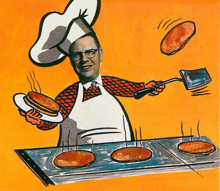 What else was new about pancake restaurants? They were part of the advent of eating places focused on single foods, such as hamburgers or pizza. Like pizza, pancakes held special charm for restaurant owners because their ingredients were cheap and no skilled cooks were needed. Plus, they weren’t just for breakfast — customers were ready to order them all day and through the night. The trade journal American Restaurant mused in 1960, “Who ever dreamed that the lowly pancake would build a fortune . . .?”