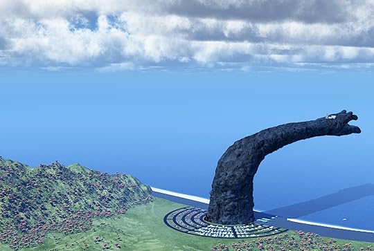 The Hand is a spectacular geological structure located on the southern shore of Lake Eprehem on the planet of Deucado. It is the center of much of the action in Rome's Evolution. I had a clear view of what it looked like in my mind but translating that dream into a physical image was a painstaking process with a lot of back and forth with my brother Bruce, illustrator extraordinaire.In the book, The Hand was formed when a large, dense meteor hit Deucado and formed the crater which later became Lake Eprehem. A large chunk of the meteor, mostly made of iron, broke off and hit the land to the south of the main meteor. This cosmic bullet continued to burrow under the earth until it hit a pocket of magma. The magma followed its path back the surface and formed a thick tower which bent over as it cooled. Another, smaller hole, opened up and shot spurts of magma up into the air which landed at the top of the tower and formed the extensions that made it look like a hand.