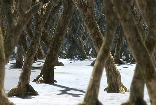 So I started with the plants. I figured that leaves would be very inefficient. They maximize surface area to capture sunlight at the expense of exposure. So I made the trees, at least, toughened and I made their bark the photosynthetic surface. A cylinder would have the least surface area exposed and the trees simply had to grow large to collect sunlight. I also wanted to portray the trees as crazy zig-zag, like Superman's Fortress of Solitude, as if they were huddling together for warmth. Here is my original concept art and then my brother Bruce's full realization which you can click to zoom in on:
