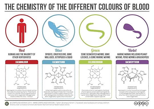 You can click on the image to get a zoomed-in version. Note the second block, entitled haemocyanin (the British spelling) which is the proper scientific term for cyanoglobin. This is the principle oxygen-carrying molecule in spiders, crustaceans, shrimp! and horseshoe crabs. According to the author, unlike hemoglobin, hemocyanin does not bind to blood cells but rather circulates freely in the blood. And just like hemoglobin, it is a different color, nearly clear, when it is devoid of oxygen and bright blue when fully oxygenated.