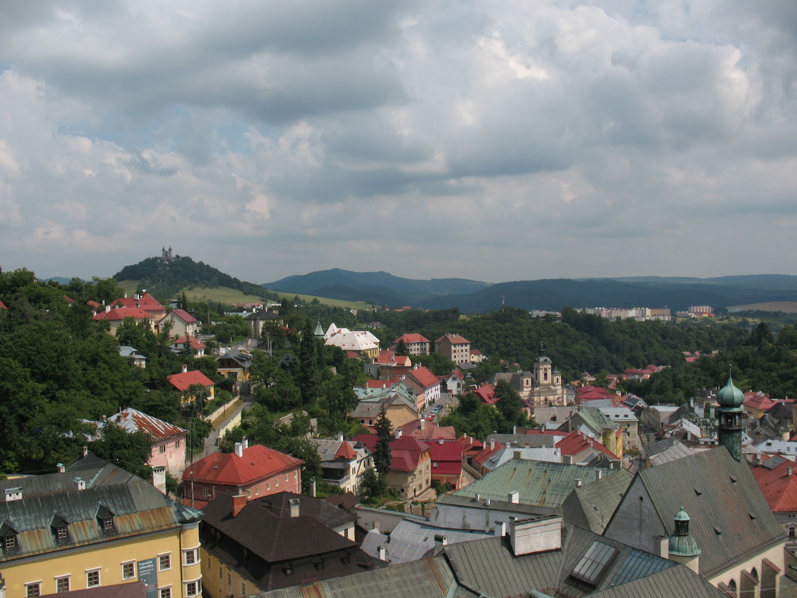 Time to return to my What I Did on My Summer Vacation series (now with yet another pic--surely you can guess what the theme is to these pictures by now, yes?). As I've said before, I was multi-tasking on this trip. One thing I really wanted to do was go to a place I'd never gone before, where I could potentially set another book in the Vodnik series. I was pretty specific in my "checklist" for a perfect spot: it had to be old, it had to be a place with a more significant Roma population than Trencin has, it had to be uniquely Slovak, and it had to have a lot of history and folklore for me to drawn on. Thankfully my brother-in-law Milos came to the rescue, finding the perfect spot: Banska Stiavnica.I'm not kidding, folks. This city is a hidden gem. Hidden for good reason--it ain't easy to get to. I wouldn't be surprised if I went to some places that less than 100 Americans have seen. Maybe less than 50. (More on that tomorrow.) There are no real highways to get there: you have to take windy back roads that are steep enough to make you wonder how in the world anyone survives a single winter there. The area's smack dab in a dense forest that crowds in on the city from all sides, like the place is under siege. You finally get out of the switchbacks, and all of a sudden you see this: