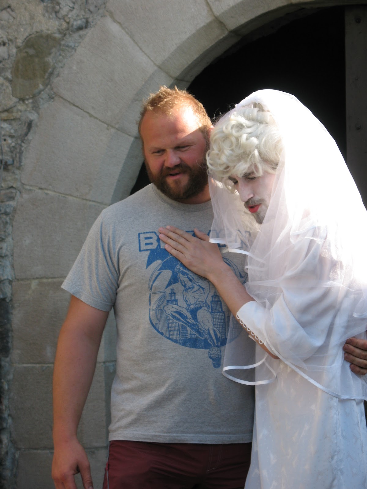 From Orava, we figured we might as well get in one more castle, so we swung by Strecno (pronounced STRETCH-no) Castle on the way home. Strecno is much more ruinous than Orava or Trencin. Pieces of Dragonheart were filmed at the castle. Not quite the same pedigree as Nosferatu, but still cool. (Dragonheart was filmed in Slovakia, and many of the castles in the area can lay claim to that. My brother-in-law also got to be an extra in some of the guard scenes, as I recall.) Both castles involved steep hikes to get to them (sort of the point, with castles), and it was a tiring day for everyone by Milos, who walks up to Trencin castle fifty times a day, just for fun. He also got to marry a ghost in a comedic number performed at the beginning of the castle tour: