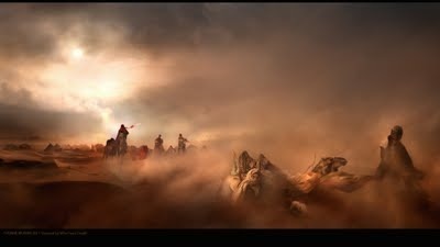 This scene depicts Onyesonwu and her companions' initial encounter with The Red People. The sandstorm parts and the next phase of the journey begins.