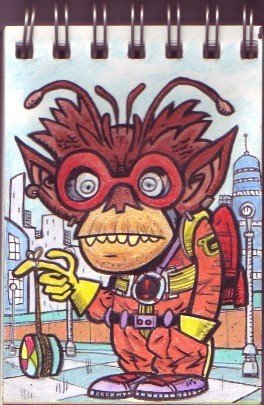 So, here's where I admit I have no idea where I'm even going with this (could you tell? Could ya, could ya?). Pretty much just typing to see what happens (It's not like I have to read this), so this is more scattershot than usual, which is saying something. I'm very tired and I'm feeling very lightheaded right now, because I'm staying up as long as I can to try to re-adjust my sleep schedule. For the past few weeks I've been getting up at a different time every day/night, working a few 18 hour days in a row and then crashing out, going to bed when the family's getting up, not leaving the house for a week at a time, that sort of thing. I'm sure a number of you freelancer-types out there know what I'm typing about. This past week has been especially long while I work on a few things at once which are due...yesterday or something. I need to put in as many hours as I can right now and I sure as hell don't bounce back from this sort of schedule like I used to when I wore a younger idiot's clothes. I was finishing up an inking job tonight, actually, that would be today, ha ha, and I wanted something throwaway to work on while the last few pages I was shuttling back and forth were drying. I figured I'd do another Kirby character because people seemed to like the Demon piece I posted the other day. To make a long, boring-as-shit non-story short: Peeper.