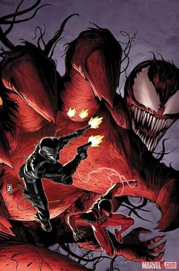 MINIMUM CARNAGE is a crossover that will take place over the course of six issues starting in October. It will bring the worlds of Venom and Scarlet Spider crashing together in a major way as Carnage breaks out of prison and ravages not only our world but another universe altogether! Alpha and Omega issues will bookend issues 10 and 11 of Scarlet Spider and 26 and 27 of Venom to bring the bloody sci-fi tale together. Chris and I are plotting together. We are co-writing the Alpha and Omega issues. Chris is handling scripting on Scarlet Spider and I’m scripting Venom (naturally). Lan Medina is handling the art on the bookend issues. Declan Shalvey is drawing Venom, and Khoi Pham is drawing Scarlet Spider.