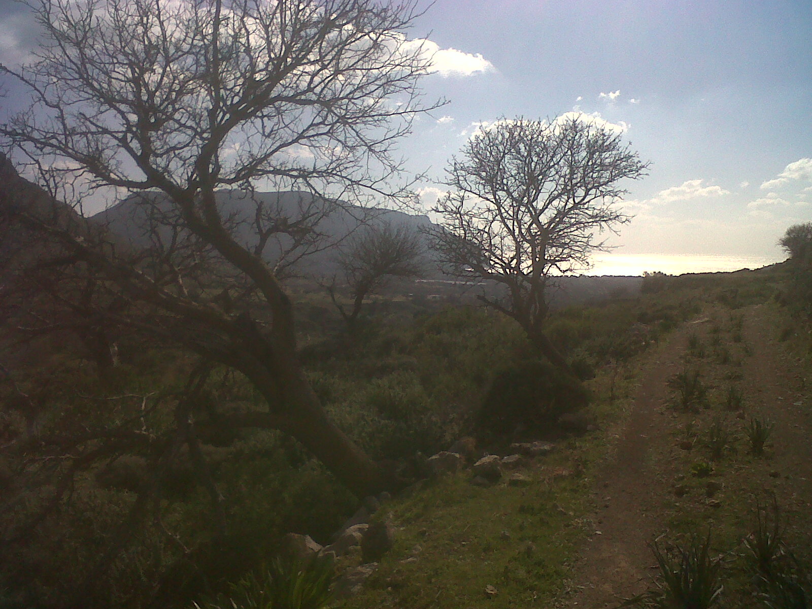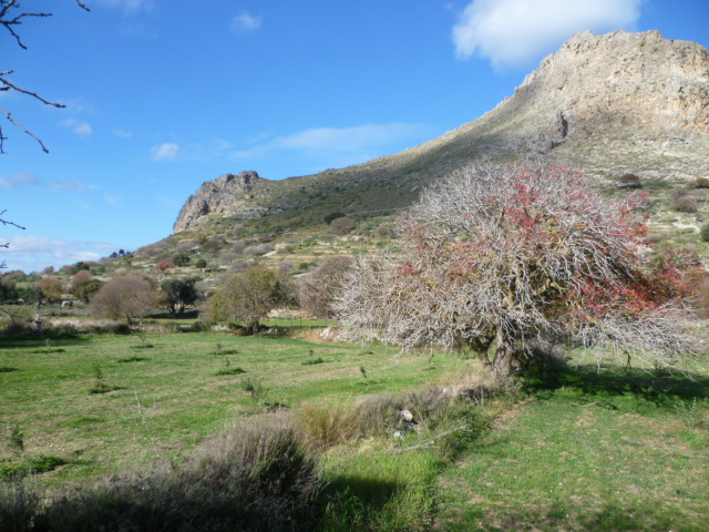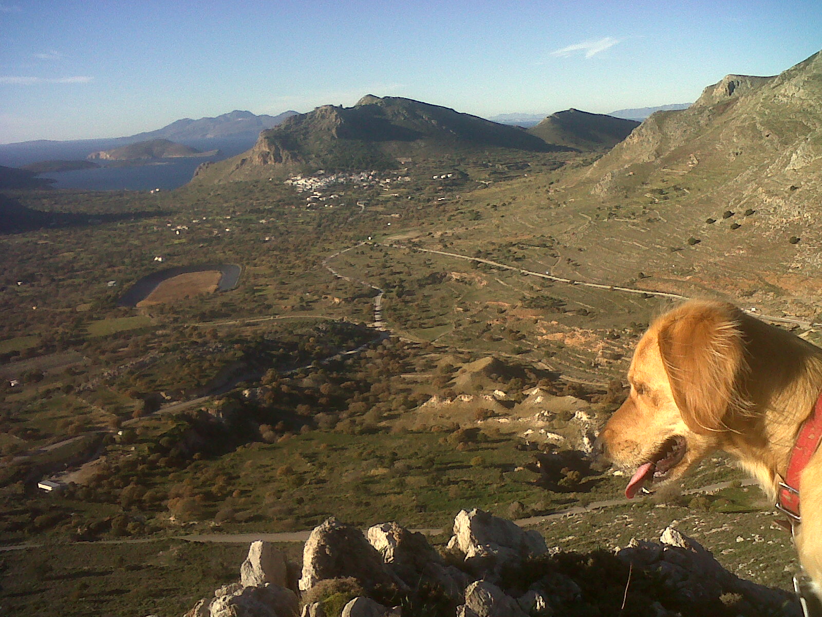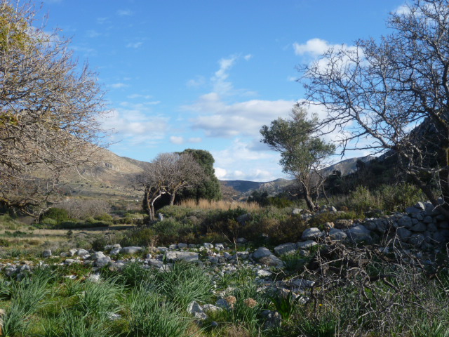 Two days ago, I finished my work and headed out for a walk, rather optimistically with a bikini in my backpack, as well as gloves and a scarf. There was a cool wind, but not cold. Down at Eristos, the bay felt sheltered and the sea was blue and clear. Jumping in was hard –no question, it was cold – but after the first few minutes, I relaxed and enjoyed it. Coming out, I piled the clothes back on and had such a burst of energy that I ran half the way home. I’d left bread dough to rise, and I could barely wait for it to finish baking before I was tearing chunks off and eating…Yesterday was overcast, and after my morning’s work I felt a little tired when I took Lisa for her lunchtime walk; not sure which direction to take, I ended up trying a track off the road towards Ayios Antonis, heading uphill on the easterly, inland side of Profitis Ilias. The track turned into a path that was soon barely perceptible and we were cutting through spiky bushes. Just the kind of thing Lisa loves – at the end of the lead she panted and surged forward on the scent of goats, leaping over thorny bushes and pulling me through stands of dead trees. At one point I thought, I’m not really enjoying this, but going back would have been just as hard as going forward, and ahead I hoped we’d be able to cross the gorge and take a track down. I was wondering how far we should go when I spotted some ruined buildings and an old chapel, so I decided to aim for that. The walk from there on led steeply up the mountain and could have been fun if I’d had more daylight and energy.