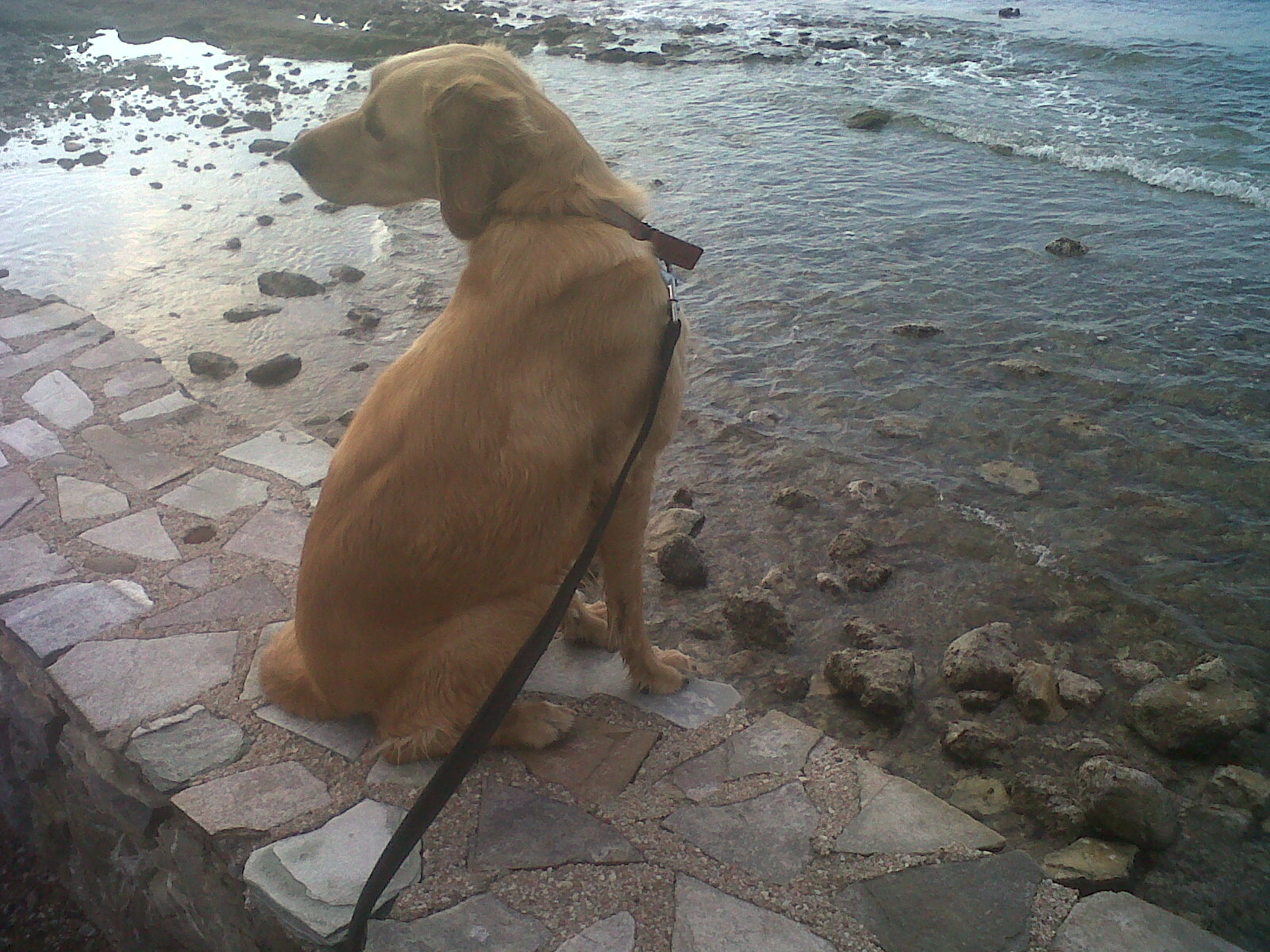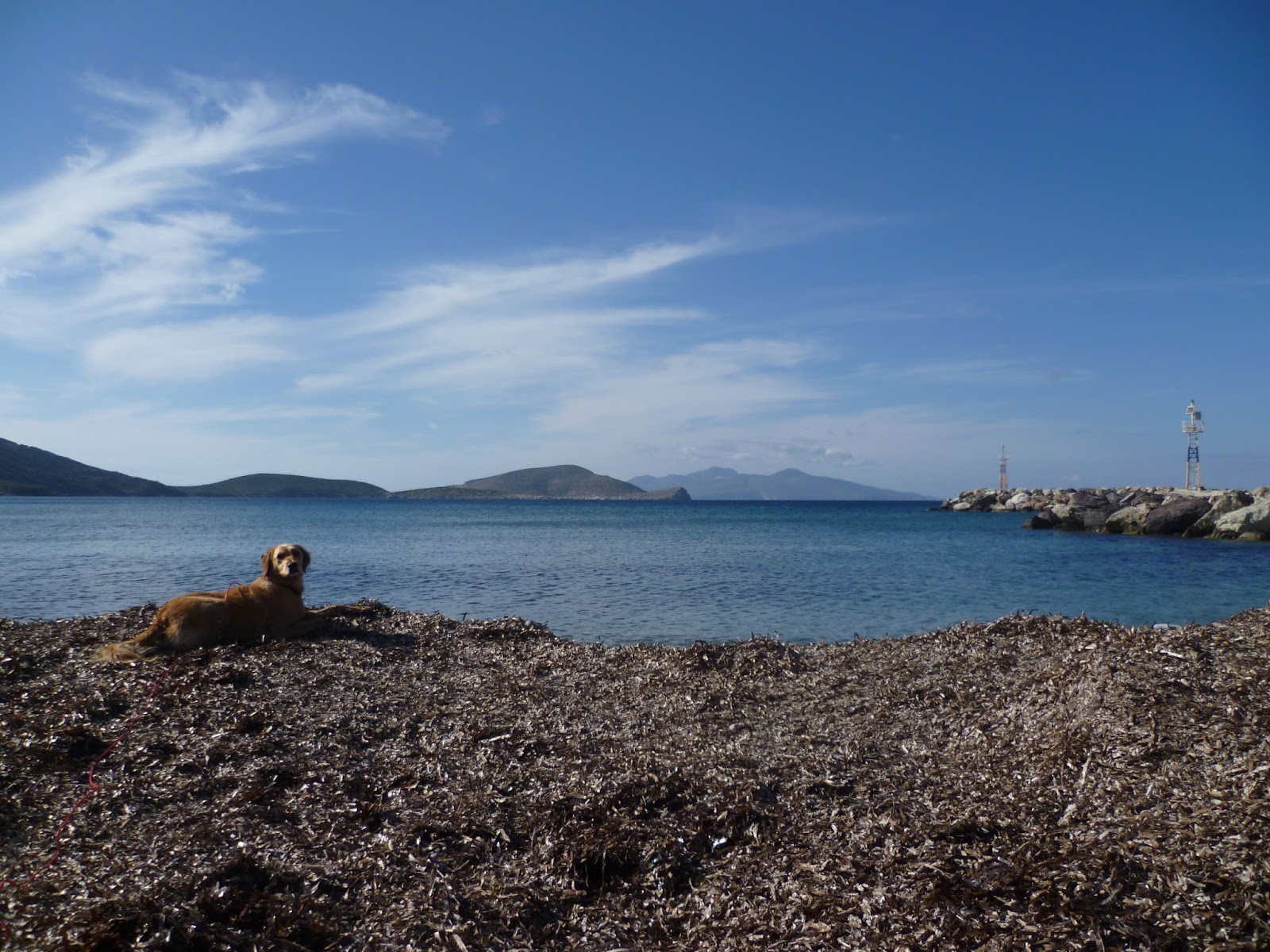 There were bees buzzing and, in the blue sky and warm sun, a feel of summer around the corner as we set off on the half-hour walk up the path to Skafi. We reached the sand and I had a sudden longing to lie down and fall asleep.Work has been excitingly busy at my home office, feeling strangely like a real office, especially when I got invited out for lunch by an editor in New York, and had to explain that it might be tricky. Not that it’s been all work this week, far from it – with a Greek television crew on the island interviewing us on Tuesday, and the Gaitanaki celebrations on Wednesday… But it’s been a full week. I’d finally found the time to clean the house from top to bottom in the morning: filling up a bag with dust and dog-hair. By 1pm, I felt it was time to give myself a long afternoon off. Lisa, funny creature of habit, tried to pull us back home because it wasn’t time to do our walk of the day yet, but I was having none of it.