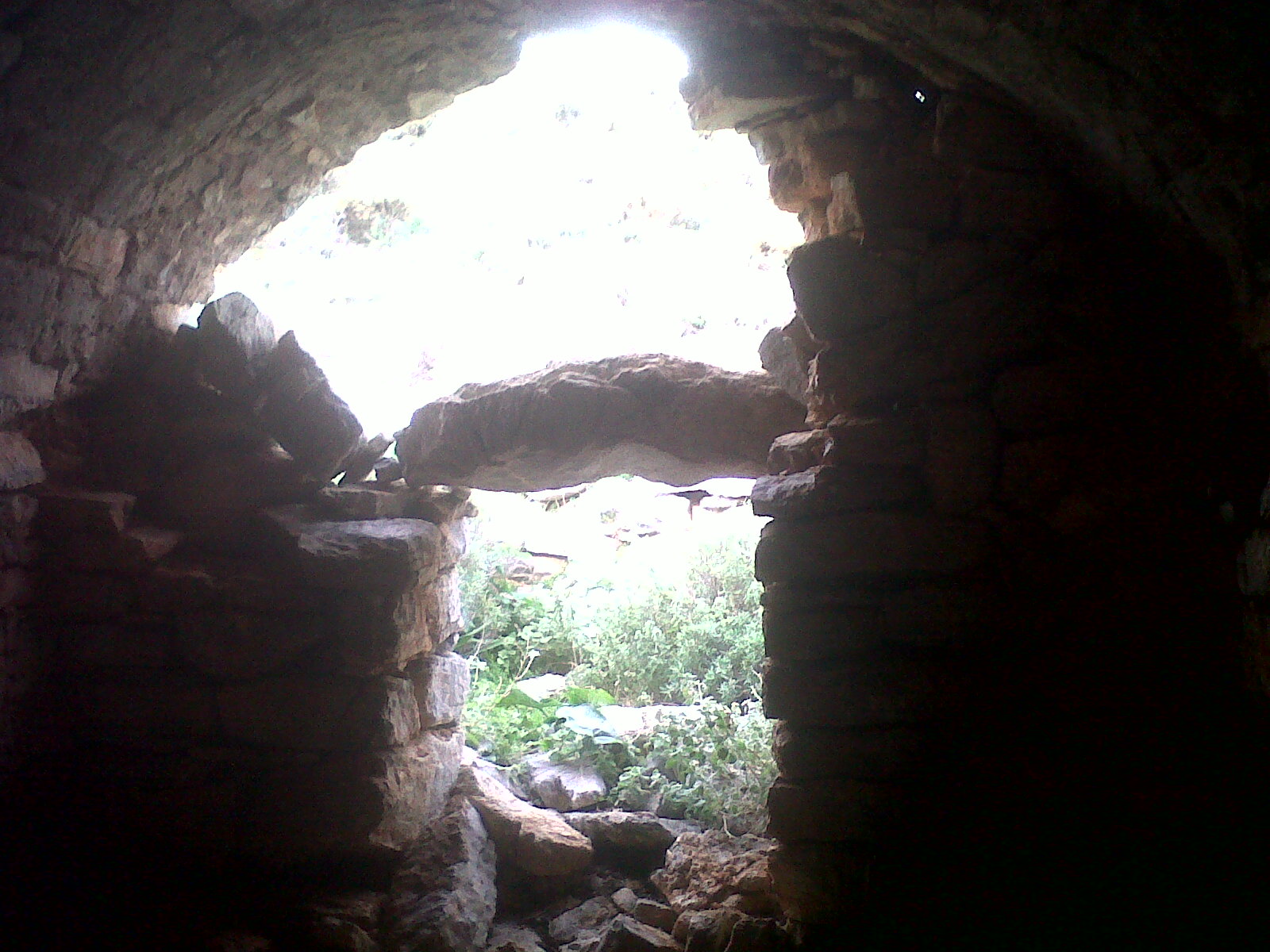 The chapel turned out to be typical of the many abandoned chapels all over the hillsides. Crouching to enter under the heavy rock lintel – the doorway was now half-sunk under rubble – I tiptoed over a carpet of goat-dung strewn with the remains of a long-dead goat to see the fallen, simple altar made from a column and a slab of marble, most likely ancient. There was a fragment of another marble slab nearby with old carving, the corner of something much bigger… The secrets these little places hold. The walls were bare stones – but no, when I looked more closely into an arched recess, I could make out very faintly the colours of Byzantine-style frescoes, including the top of a saint’s head, with a tiny forelock of hair.